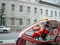 イケメンサンタさんにも運転席からちょっと外れてもらい、同行してくださっていたベロタクシー社長さんにもアングルを確認してもらい、K嬢にはこの三脚を…えーっと、K嬢?