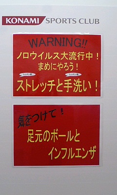 私の通っているスポーツクラブに貼られていたポスターです。ストレッチでノロが防げるとは思えないのですが、必死で予防を訴えてくれているので、頑張って通って基礎体力をつけようと思います。