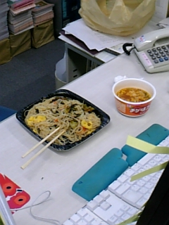 ←アナザー女子スタッフ・めぐっぺの机の上にアジアンワールドが広がっていました。(デスクというより倉庫に近い机の上…)「中華が食べたかったんですよ〜」と言いつつ、並んでいたのはビーフンとキムチチゲ。