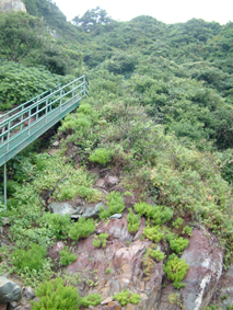 上の写真のように、ロッククライミング並みに登るところもあれば、断崖を横の鎖一本でカニ歩きするところもあり。
