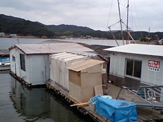 海から陸にあげるその2分ですらもったいない、と養殖場に牡蠣小屋を作ってしまった模様。養殖場の周りの海に、ぷかぷか浮かぶプレハブの上で牡蠣を焼くのです。
