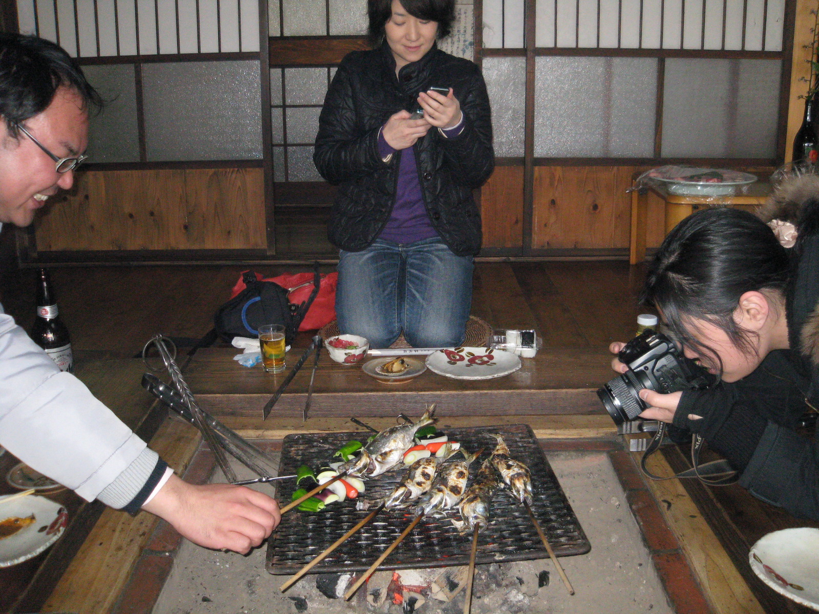 の様子。囲炉裏で焼かれる鯵に五島牛にヒオウギ貝に・・・ピーマン。