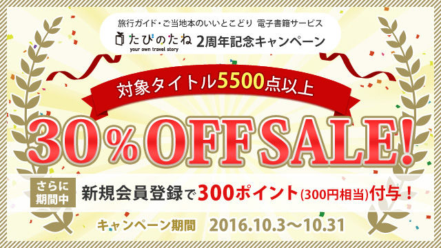 弊社からは、「九州王国」と「江戸楽」を取り扱っていただいている電子書籍サービス「たびのたね」さんが、10月中2周年記念の特別セールを開催するそうです。