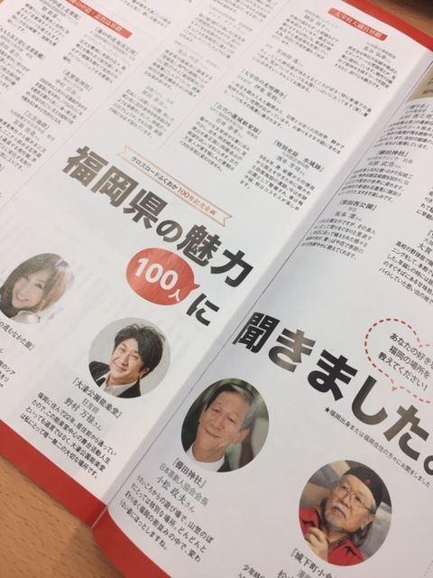 で、巻頭特集の「福岡県の魅力、100人に聞きました」という企画ページを作らせていただきました。この画像を見ておわかりの通り、月刊はかたファミリーの小松政夫さん、森口博子さんに加えて、いつもお世話になっている松本零士さんや野村万禄さんなど、弊社のありとあらゆる人脈を駆使して、福岡中の100人の「好きな場所」を一気に集めた次第です。