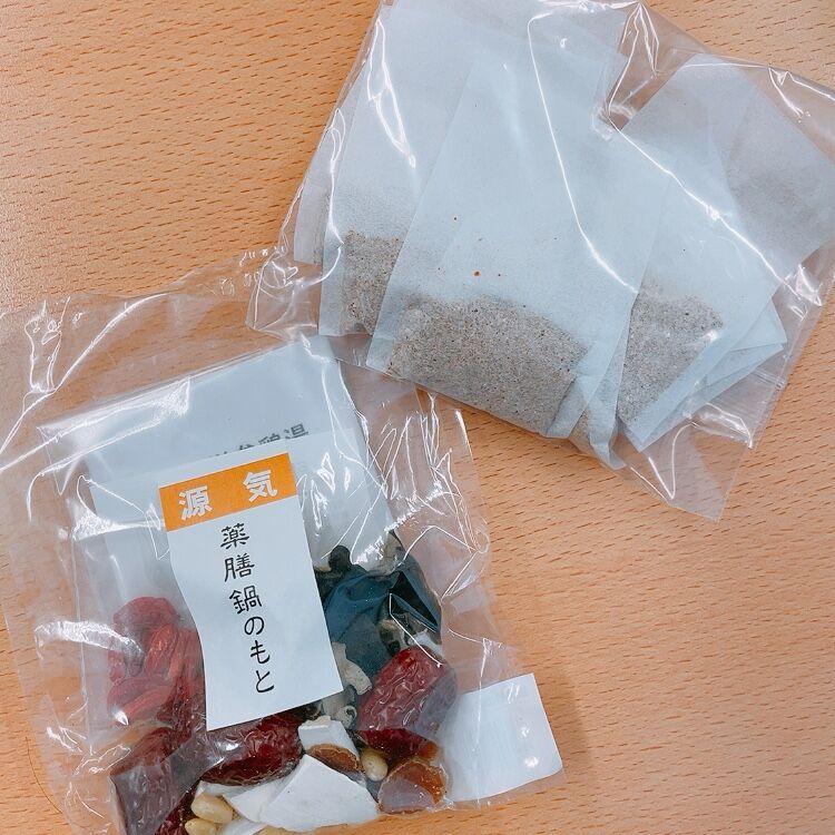 ヤナッチが取材先から持って帰ってきた漢方グッズ。右上はお茶で、左下は参鶏湯用薬膳だそうです。