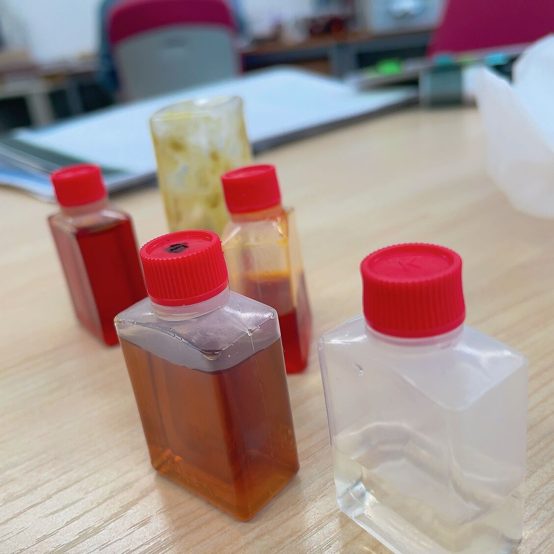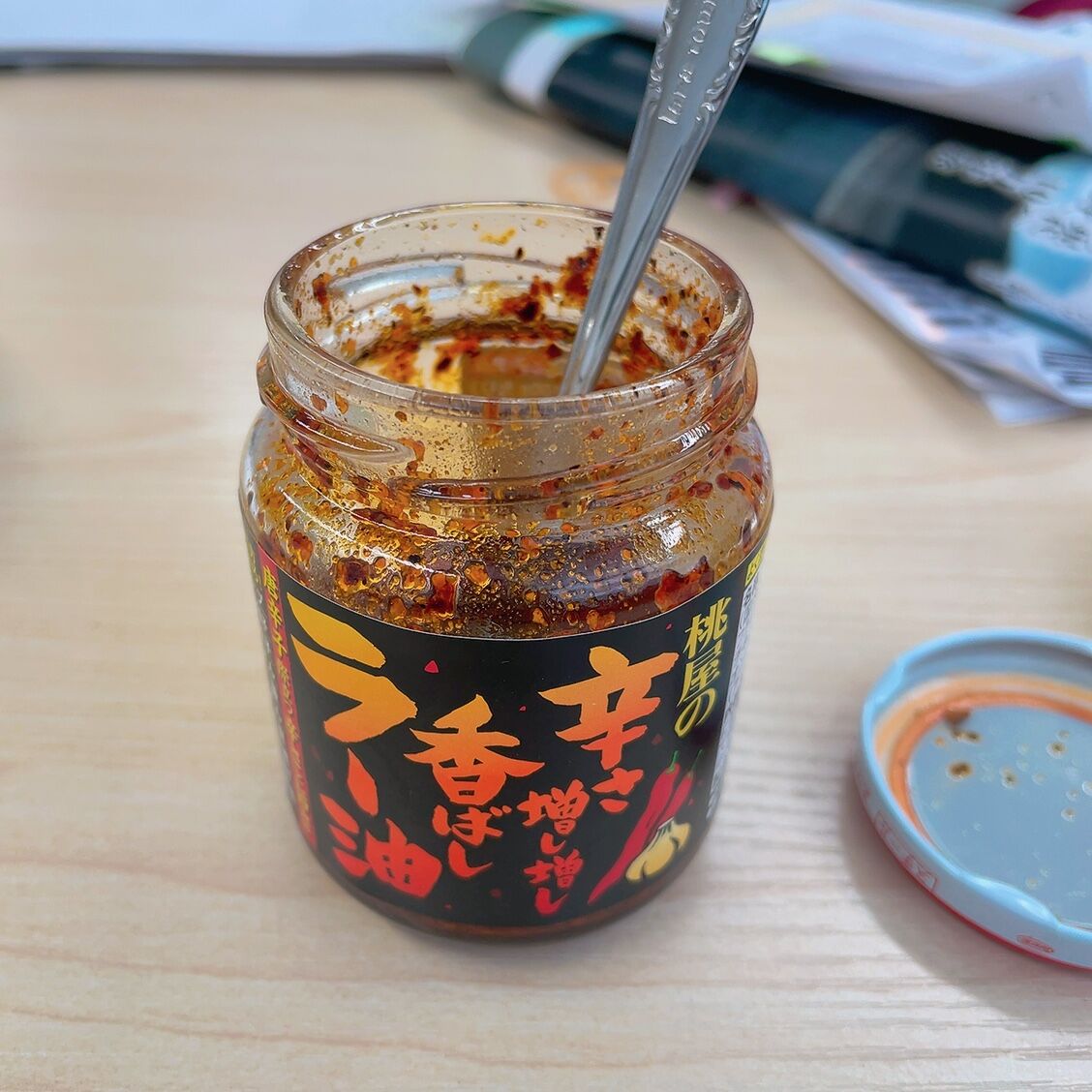 まりもさんは、味変調味料をいつも入れてくれます。この柚子胡椒とラー油がめちゃくちゃ美味!(↑すでに柚子胡椒、カラになってる…