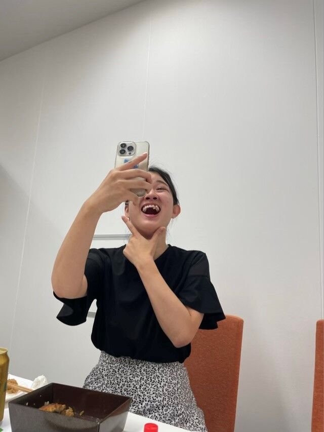 最後、「人に撮ってもらうより自撮りしたほうが、ベストタイミングで撮れるので盛れます!」と言う先生。実践する生徒。