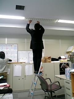 今日は感電死の心配もなく、社長机を土足で踏みつけることもなく、業者さんのようにいそいそと蛍光灯を変えてくれている編集長の図です。