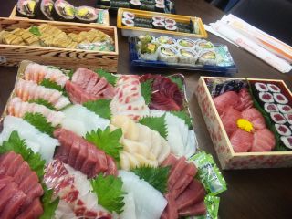 社長が東京より来福すると、おいしいものをいただける…というのが編集部の定説になって久しいです。本日もコンビニおにぎりを片手で食べる私と、コンビニパンをくわえてお出かけする編集長を見て不憫に思われたのか、16時ごろにこの豪華お刺身セットが編集部に並びました。